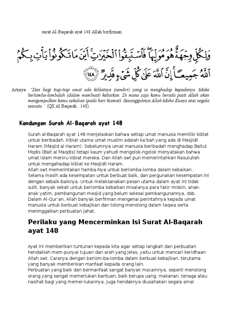 148 Isi Kandungan Setiap umat mempunyai. Isi Kandungan Surah Al Baqarah Ayat 148 Ayat ini menegaskan bahwa tiap-tiap umat Nabi-nabi terdahulu memiliki kiblatnya masing-masing untuk menghadap kepada Allah swt.